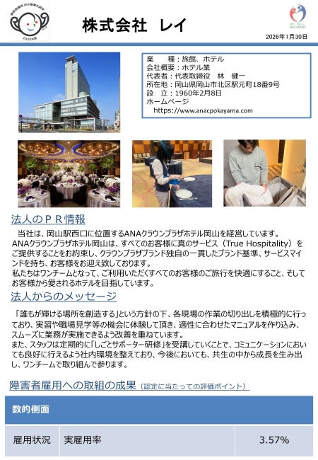 株式会社レイは、岡山駅西口に位置するANAクラウンプラザホテル岡山を経営しています。ANAクラウンプラザホテル岡山は、すべてのお客様に真のサービス(True Hospitality)をご提供することをお約束し、クラウンプラザブランド独自の一貫したブランド基準、サービスマインドを持ち、お客様をお迎え致しております。ワンチームとなって、ご利用いただくすべてのお客様のご旅行を快適にすること、そしてお客様から愛されるホテルを目指しています。