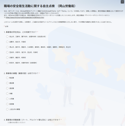 岡山労働局におきましては、第14次労働災害防止推進計画の取り組みの一環として、「職場の安全衛生活動に関する自主点検」を無記名調査により実施し、計画期間中の労働安全衛生施策の参考にさせていただくことといたしました。この自主点検は、今後の労働安全衛生に関する取り組みを推進する上で、とても大切な情報となります。