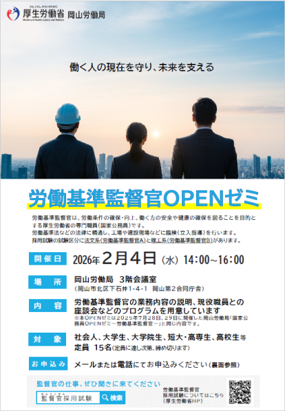 岡山労働局では、労働基準監督官の職務内容やキャリアパスに関する説明会を開催します。