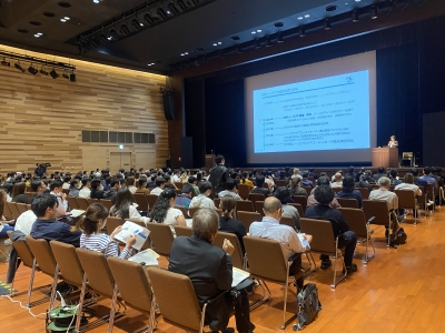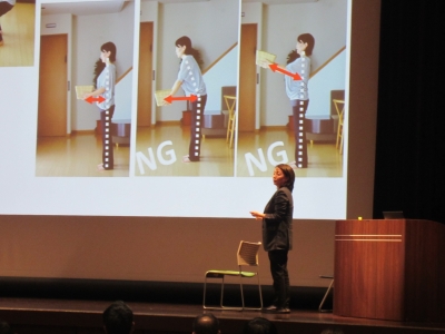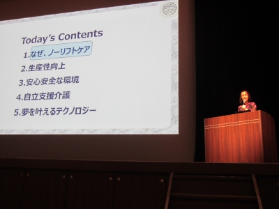 特別講演第1部では、昨年県内3か所で講演いただいた、我が国のノーリフトケアの先駆者である一般社団法人日本ノーリフト協会の保田淳子代表理事をお招きしました。保田代表理事は、ノーリフトケアを進めることは腰痛予防だけでなくケアの質の向上、介護される人も負担が減り働き方の見直しになる、と説明し、介護のプロとしてのケアの質・評価の考え方、ノーリフトケアの教育内容や取組を進めていく上のポイントなどを実例も交えて非常にわかりやすくご講演いただきました。