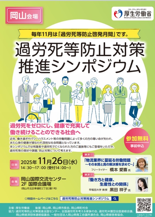 過労死等防止対策推進法において、11月は「過労死等防止啓発月間」とされています。岡山労働局では同月間にあわせ、過労死等の一つの要因である長時間労働の削減等、過重労働の解消に向けた集中的な周知・啓発等の取組を行う「過重労働解消キャンペーン」を実施します。