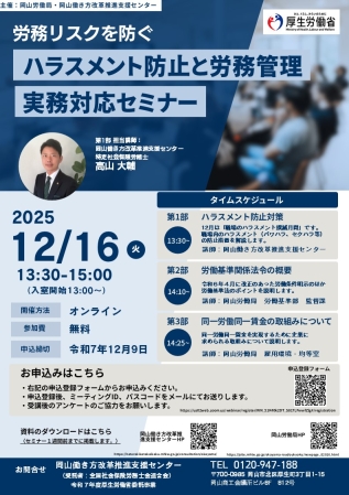 「労務リスクを防ぐハラスメント防止と労務管理実務対応セミナー」を岡山労働局と岡山働き方改革推進支援センターで共同開催することとしました。