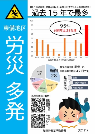 和気労働基準監督署(署長:森岡直樹)の管内において、令和7年は、10月末時点で95件の労働災害(休業4日以上。新型コロナウイルス感染症によるものを除く。)が発生しています。