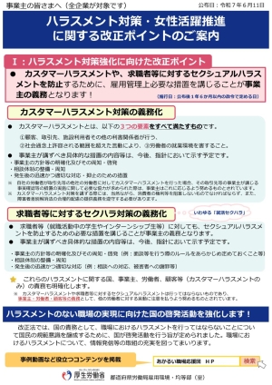 ▶リーフレット「ハラスメント対策・女性活躍推進に関する改正ポイントのご案内」(PDF:285KB)