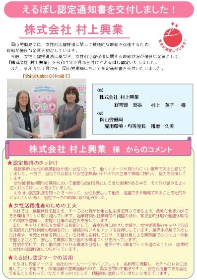 今般、女性活躍推進法に基づき、女性の活躍推進に関する取組状況が優良な企業として、「株式会社村上興業」(岡山市東区)を令和7年12月25日付けでえるぼし認定いたしました。