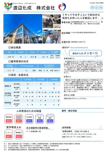 令和6年9月19日(木)、渡辺化成株式会社において認定通知書交付式を行い、笠岡公共職業安定所 新木 義則 所長(左)が、渡辺化成株式会社 代表取締役 渡辺 正彦 氏(右)に、ユースエール認定通知書をお渡ししました。