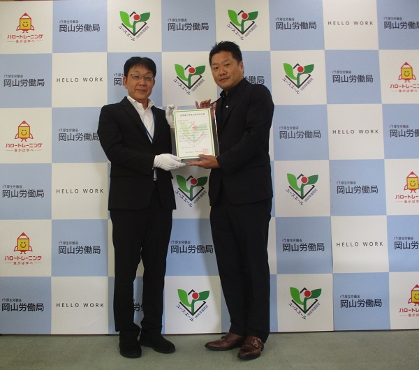 令和7年9月9日(火)、岡山公共職業安定所において認定通知書交付式を行い、同所 赤木 伸二 所長(左)が、東亜興産 株式会社 代表取締役 三宅 正浩 氏(右)に、ユースエール認定通知書をお渡ししました。