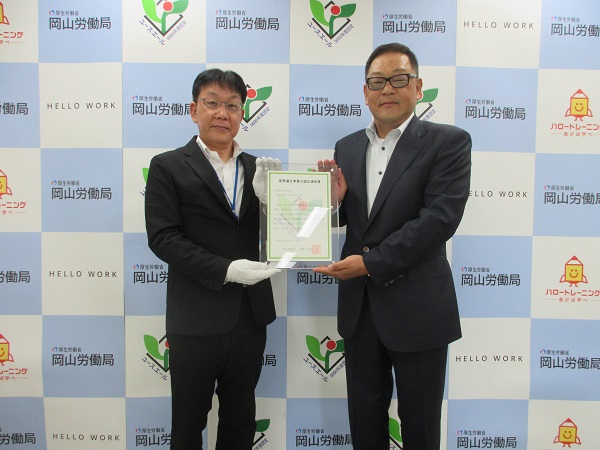 令和7年10月20日(月)、岡山公共職業安定所において認定通知書交付式を行い、同所 赤木 伸二 所長(左)が、大和建設株式会社 代表取締役 片山 博文 氏(右)に、ユースエール認定通知書をお渡ししました。