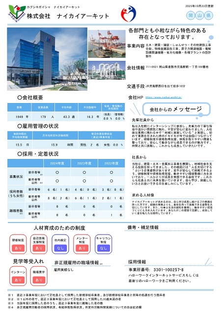 株式会社ナイカイアーキットは、ナイカイ塩業グループの一員で、建築・土木・金属加工事業を展開している企業です。