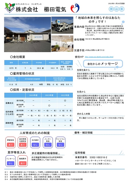 株式会社櫛田電気は、津山市を中心とした一般住宅、商業施設、公共施設における電気設備工事の設計・施工を行っている企業です。