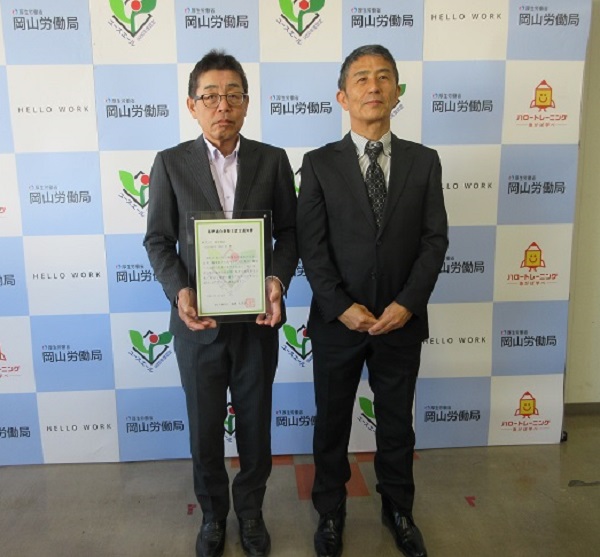 令和8年3月11日(水)、倉敷中央公共職業安定所において認定通知書交付式を行い、同所 井上 学 所長(右)が、株式会社榊󠄀原建設 取締役社長 守屋 良紀 氏(左)に、ユースエール認定通知書をお渡ししました。