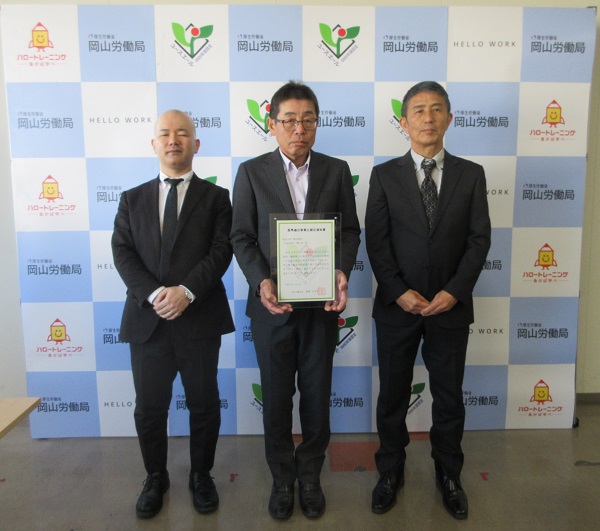 左から 大野浩司 岡山労働局職業安定部長、取締役社長 守屋 良紀 氏、井上 学 所長