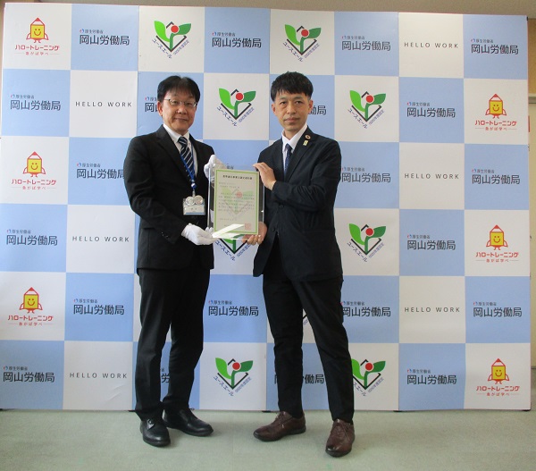 令和8年3月26日(木)、岡山公共職業安定所において認定通知書交付式を行い、同所 赤木 伸二 所長(左)が、株式会社 エスライン 専務取締役 黒住 仁志 氏(右)に、ユースエール認定通知書をお渡ししました。