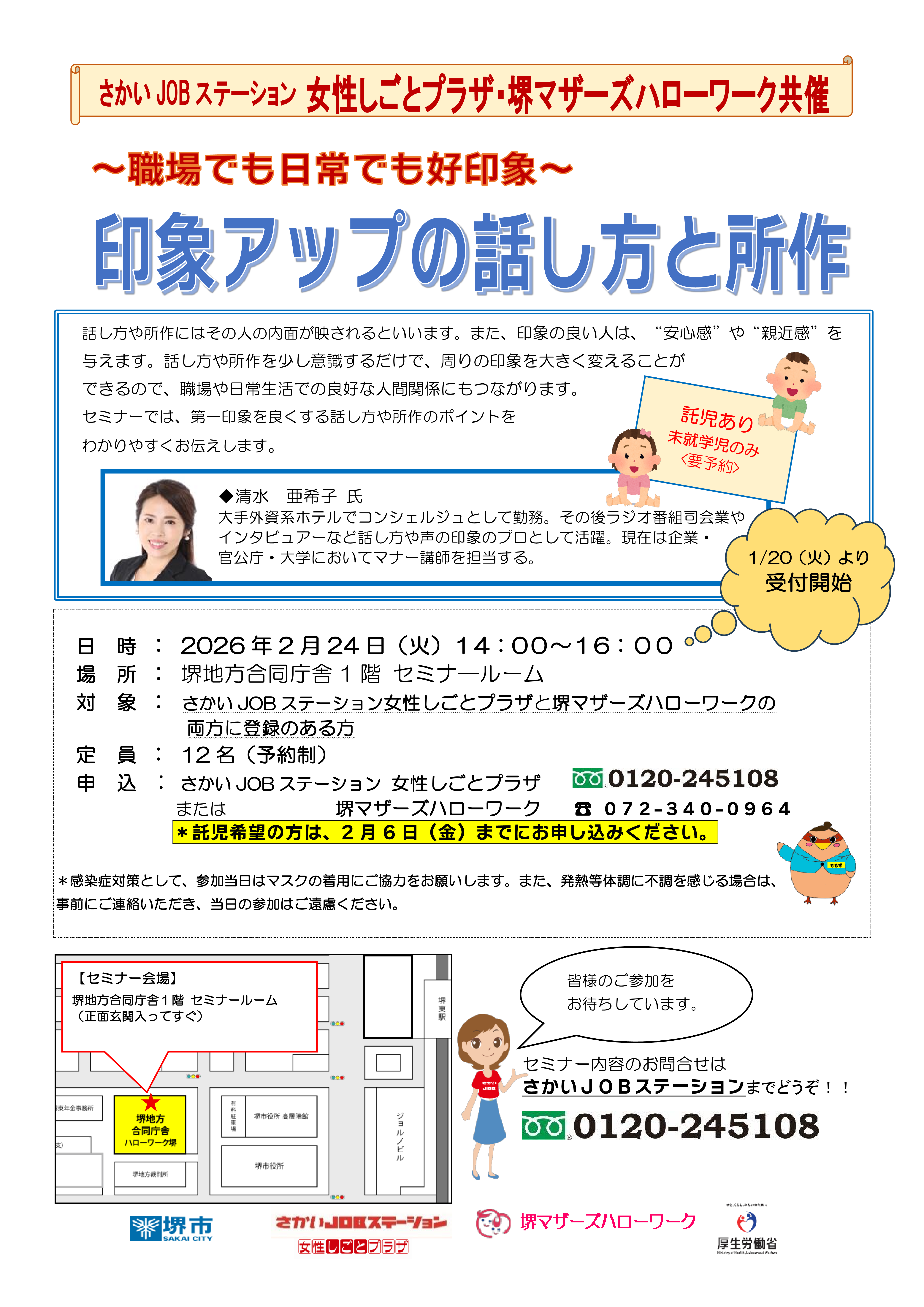 - さかいJOBステーションとハローワークの両方に登録のある方(前日までに登録していただければ、申込時に登録がなくてもかまいません) 定員:12名(予約制)