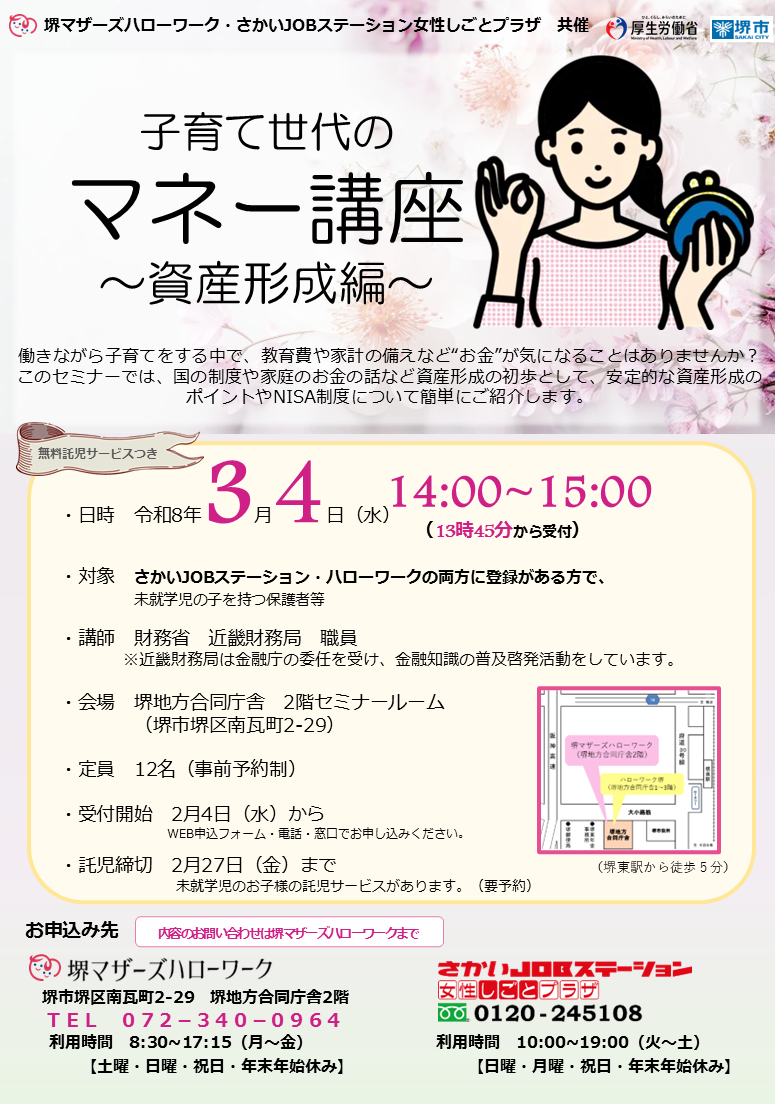 - さかいJOBステーションとハローワークの両方に登録のある方(前日までに登録していただければ、申込時に登録がなくてもかまいません) 定員:12名(予約制)