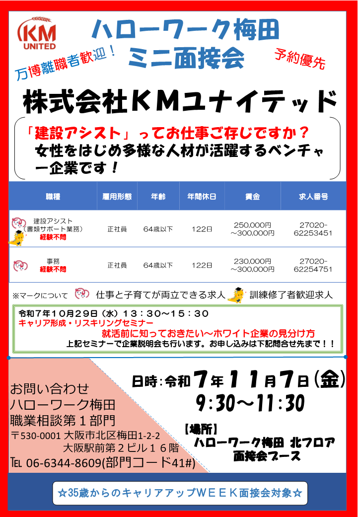 大阪府内のハローワークにおいて、概ね35歳~59歳の求職者を対象とした面接会を開催します。