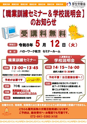 | ■ | 内容 | 19校の訓練校がハローワーク枚方へやってきます!複数の学校の担当者から直接お話を聞くことが可能です。予約不要、入退場自由、当日参加もOK。あなたにぴったりの訓練コースを見つけるチャンスです! ※在職中の方、短時間、短期間のお仕事を希望される方は原則、訓練の受講ができません。 ※雇用保険の求職活動実績になります。 |