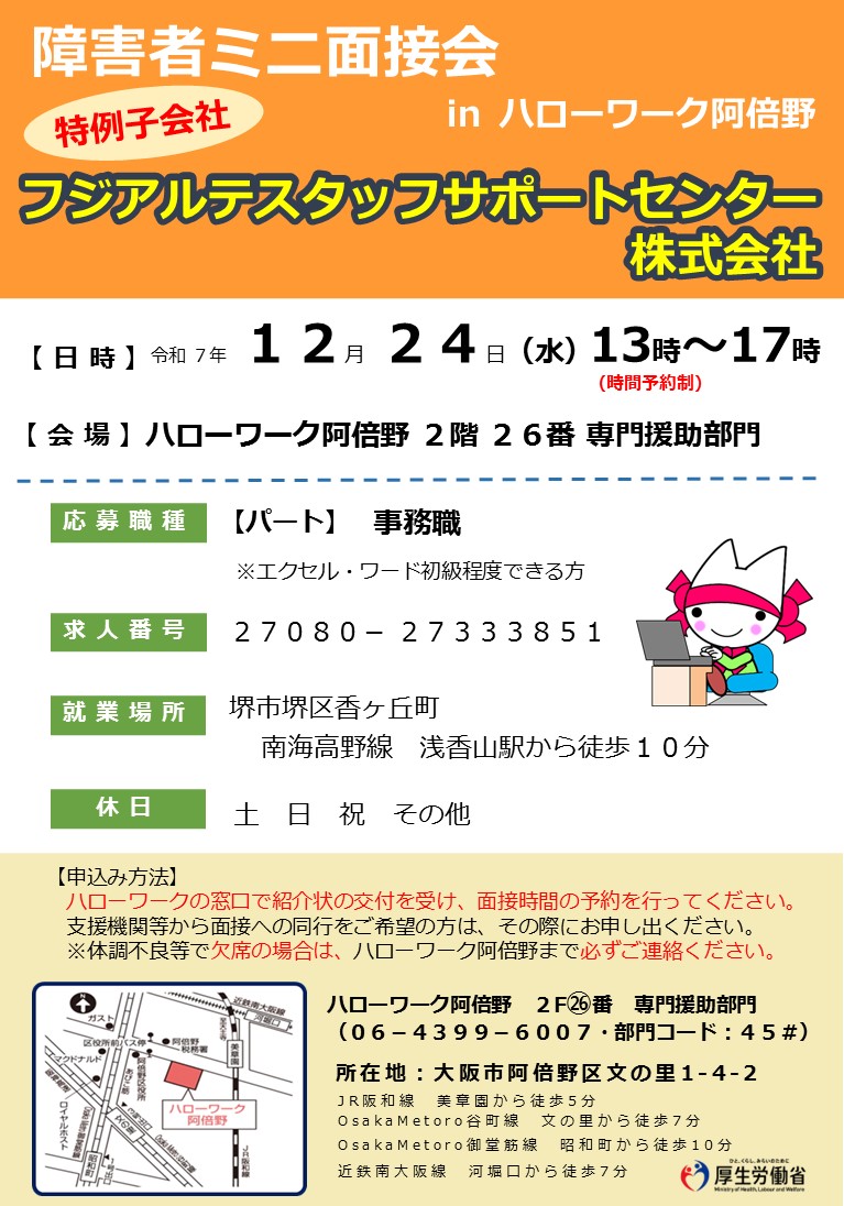 ハローワークで実施する1社限定の障害者求人に対しての面接会です。面接可能時間は、平日午後の中から、相談の上決めさせていただきます。