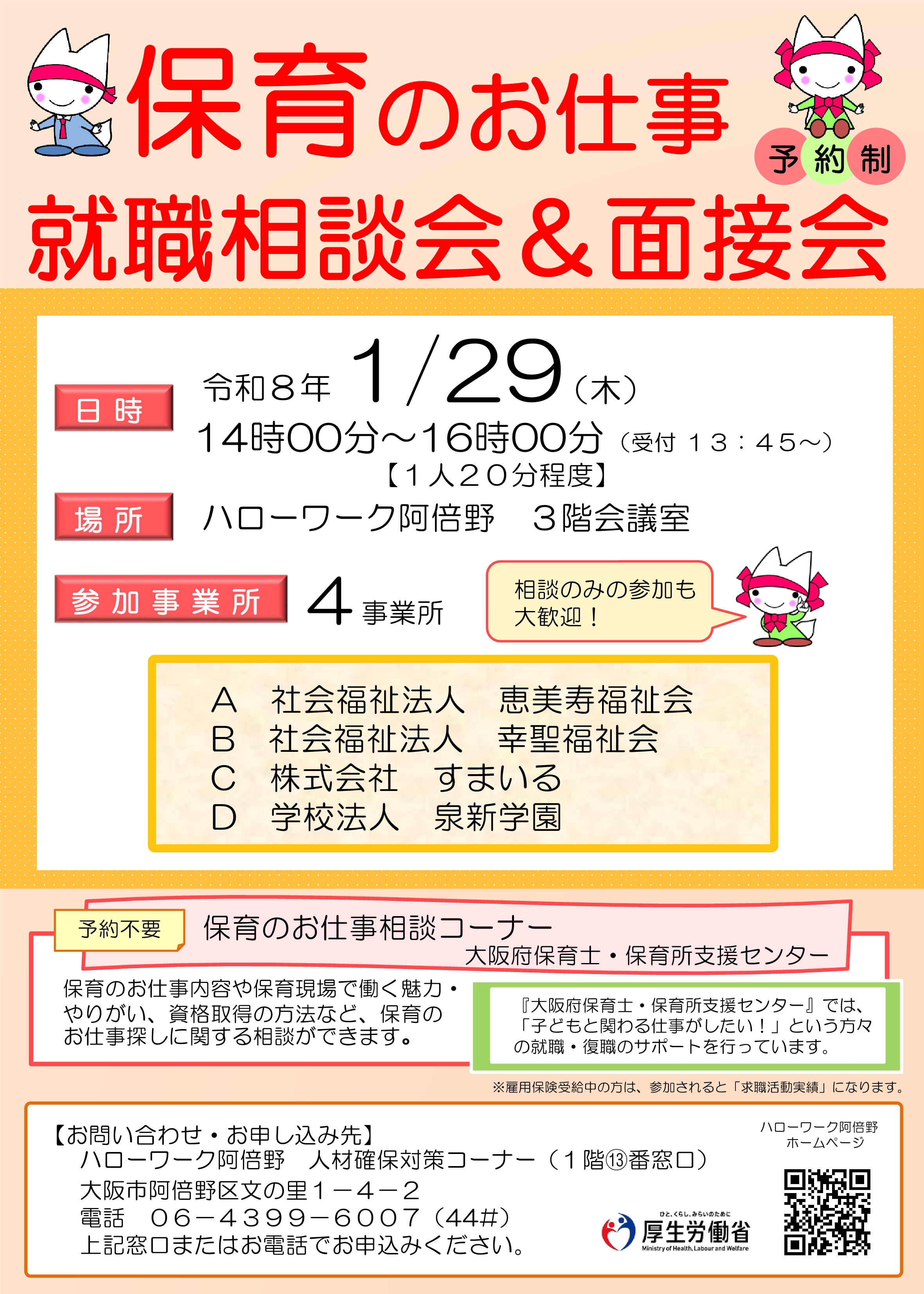 1月29日(木) 保育のお仕事 就職相談会&面接会を開催します!【4事業所参加】