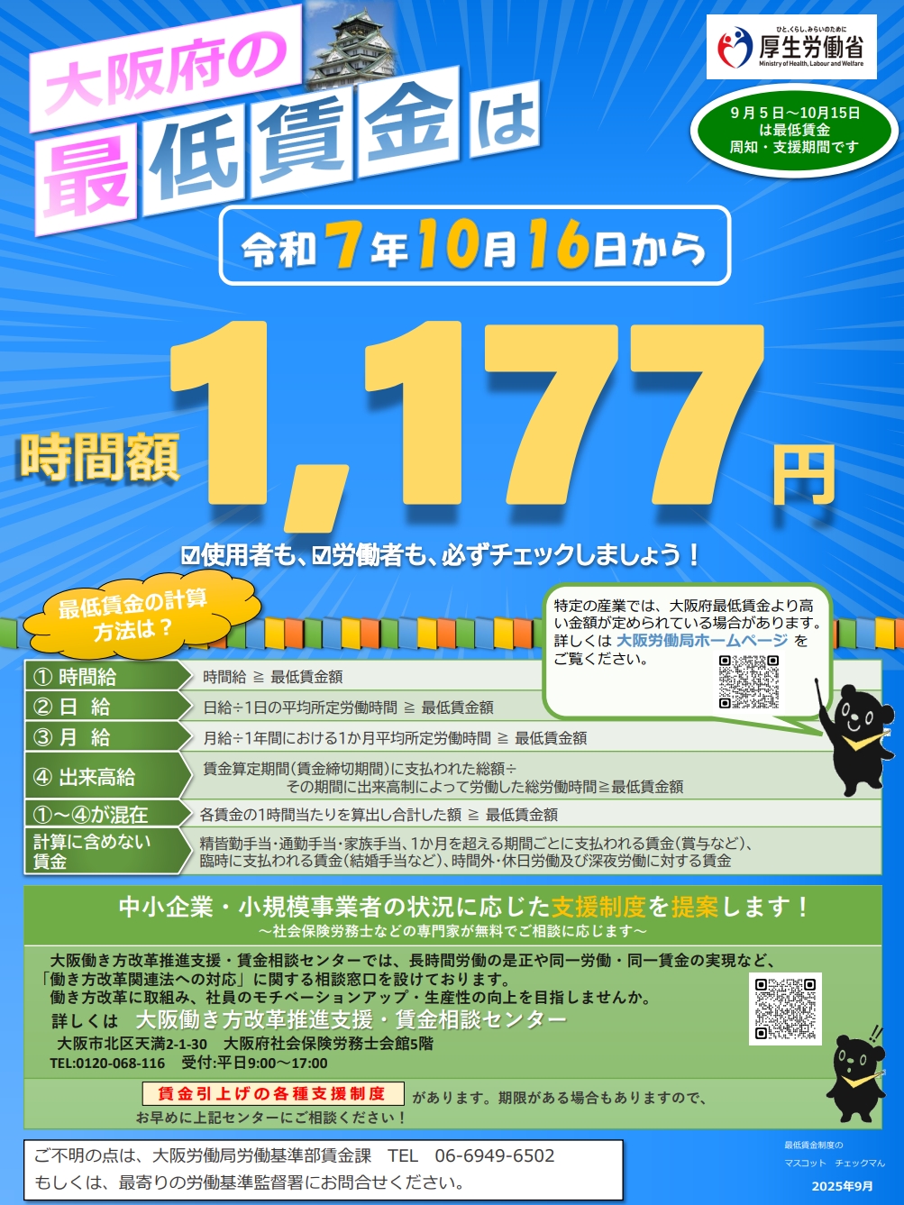 ◇◆ 大阪府最低賃金額(時間額):1,177円(令和7年10月16日より) ◆