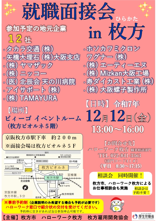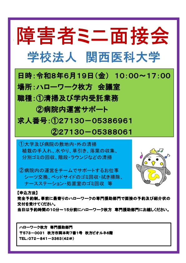 ハローワーク枚方 〒573-0031 枚方市岡本町7-1 枚方ビオルネ6階 TEL : 072-841-3363 Copyright(c) Osaka Labour Bureau. All rights reserved. |