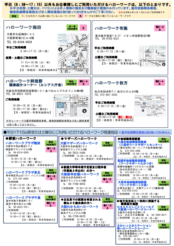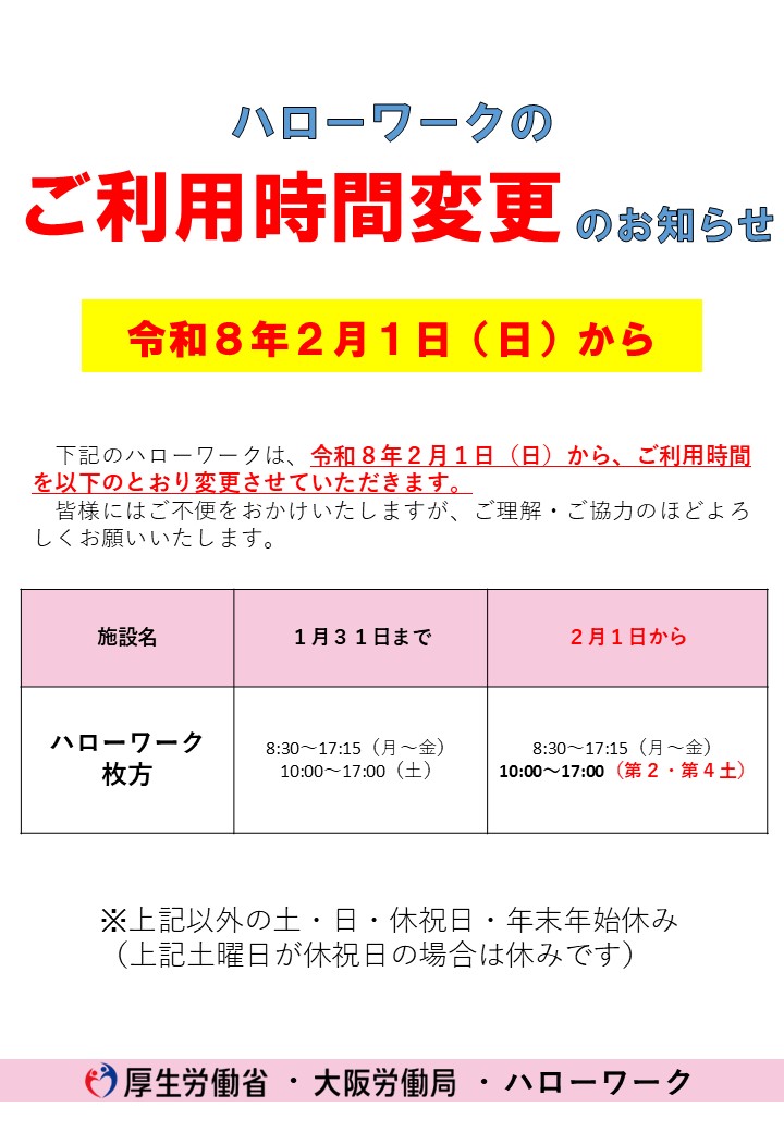 日頃よりハローワーク枚方をご利用いただき、ありがとうございます。 ハローワーク枚方は、令和8年2月1日(日)から、ご利用時間を 毎週土曜日の開庁から、第2・第4土曜日の開庁に変更させていただきます。 皆様にはご不便をおかけいたしますが、 ご理解・ご協力のほどよろしくお願いいたします。