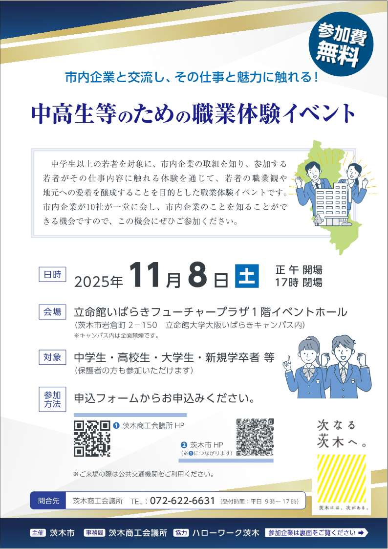 中学生以上の若者を対象に、茨木市内の企業の取組を知り、仕事内容に体験できるイベントです。
