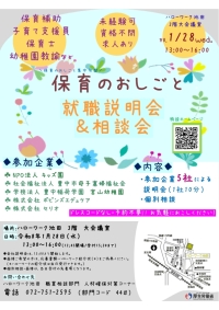 保育のお仕事に興味・関心がある方を対象に、参加企業5社による説明会(1社10分)、就職相談会を実施します。