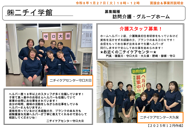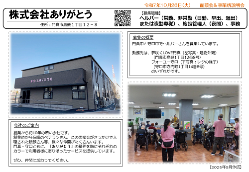ハローワーク門真では、毎月第4火曜日(祝祭日除く)に「介護のお仕事 事業所面接会&相談会」を開催しております。