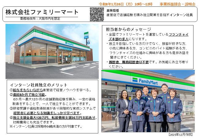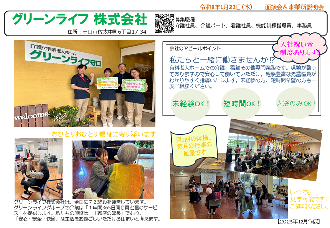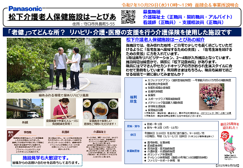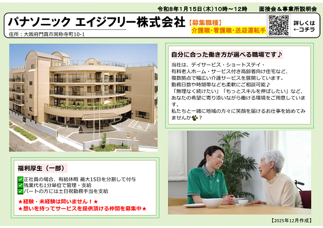 「事業所面接会」では、当所管内(門真市・守口市・大東市・四條畷市のいずれか)を就労場所とする介護事業者にご参加いただき、面接はもちろん説明のみを希望される方もご参加いただけます。