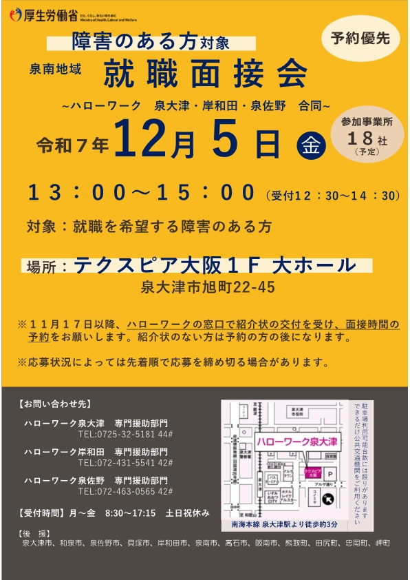 ハローワーク岸和田では、就職を希望する障害のある方(※1)のために、お仕事に関する情報を提供したり、就職に関する相談に応じるなど、きめ細かい支援体制を整えています。