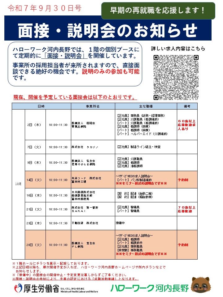 ハローワーク河内長野では、企業の採用担当者にお越し頂いて面接・説明会を行っています。
