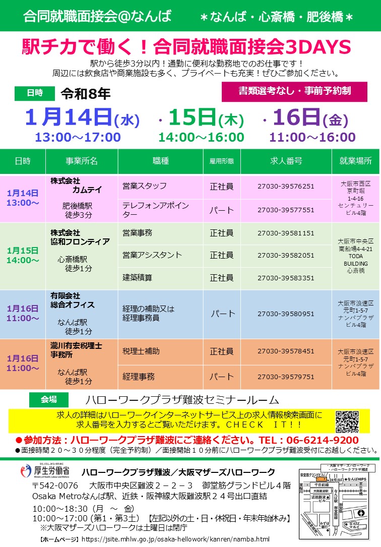 書類選考なし! 直接会社と話せる!! 駅から徒歩3分以内!通勤に便利な勤務地です。 ぜひご参加ください★ 【会場】ハローワークプラザ難波 セミナールーム 大阪市中央区難波2-2-3御堂筋グランドビル4階 【お申込】06-6214-9200 月~金 10:00~18:30 第1・3土 10:00~17:00 |