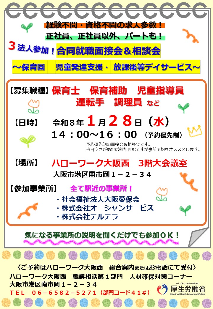 書類選考なし! 気になる事業所の話を聞くだけでもOK☆ 経験不問・資格不問の求人も多数★ お気軽にご参加ください! 【会場】ハローワーク大阪西 3階大会議室 大阪市港区南市岡1-2-34 【お申込】06-6582-5271 部門コード41♯ 月~金 8:30~17:15 |