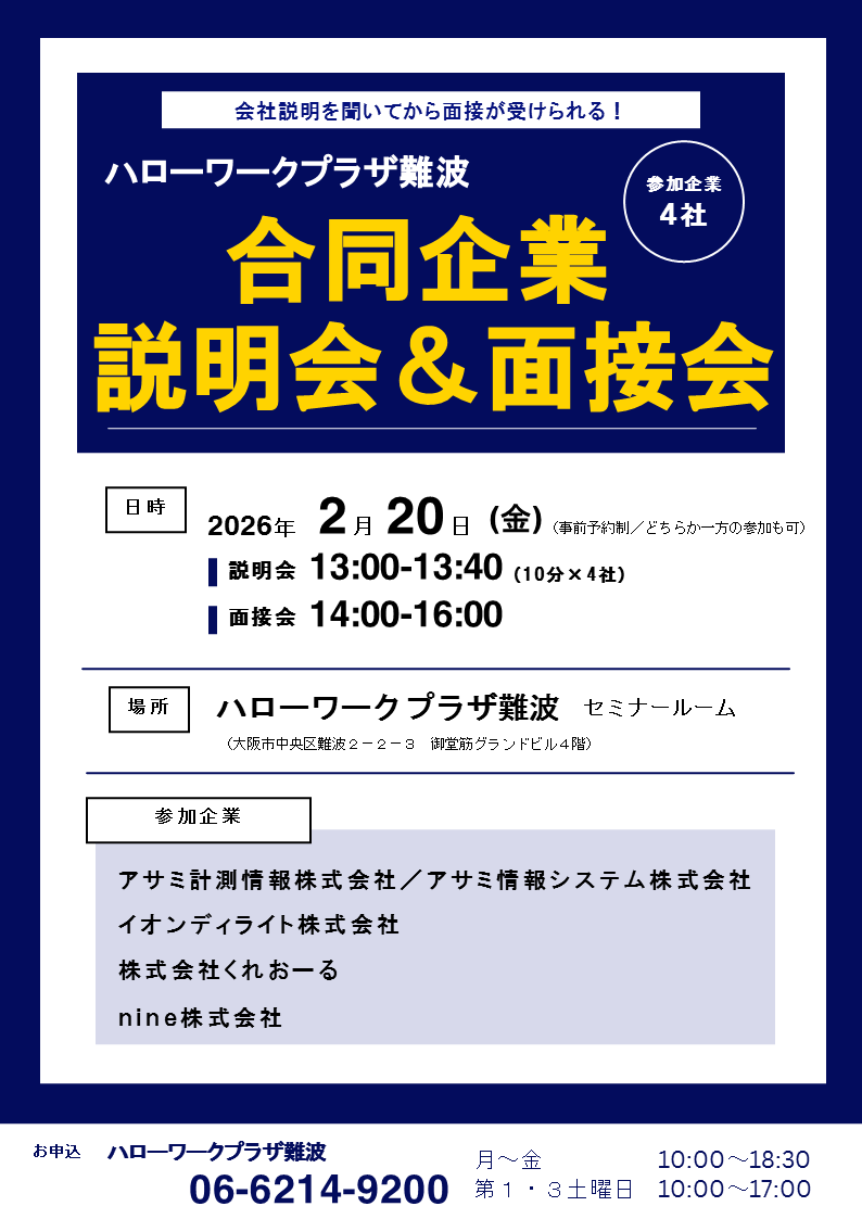 会社説明を聞いてから面接が受けられる! 企業説明会 13:00~13:40(10分×4社) 面接会 14:00~16:00 ※事前予約制/どちらか一方の参加も可 【会場】ハローワークプラザ難波 セミナールーム 大阪市中央区難波2-2-3 御堂筋グランドビル4階 【お申込】06-6214-9200 月~金 10:00~18:00 第1・3土曜日 10:00~17:00 |