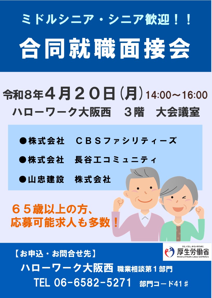 書類選考なし! 直接会社と話せる!! ミドルシニア・シニアも大歓迎です! ぜひ、ご参加ください☆ 【会場】ハローワーク大阪西 3階大会議室 大阪市港区南市岡1-2-34 【お申込】06-6582-5271 部門コード41♯ 平日 8:30~17:15 |