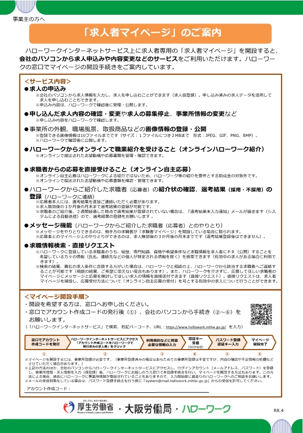 ハローワークインターネットサービス上に求人者専用の「求人者マイページ」を開設すると、会社のパソコンから求人申込みや内容変更などのサービスをご利用いただけます。⇒求人者マイページの操作方法の詳細は「求人者マイページ操作ガイドブック」をご覧ください。