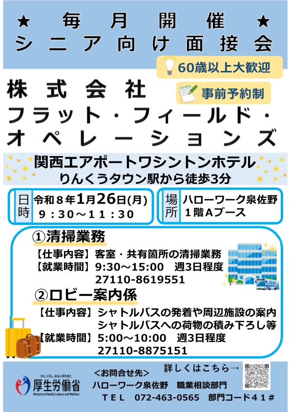 | 清掃(りんくう総合医療センター) | パート | 不問 | 3人 | 27140-7843651 | |