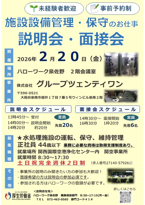 | 水処理施設の運転、保守、維持管理 | フルタイム | 44歳以下 | 普通自動車運転免許(AT限定不可) | 27140-579261 |