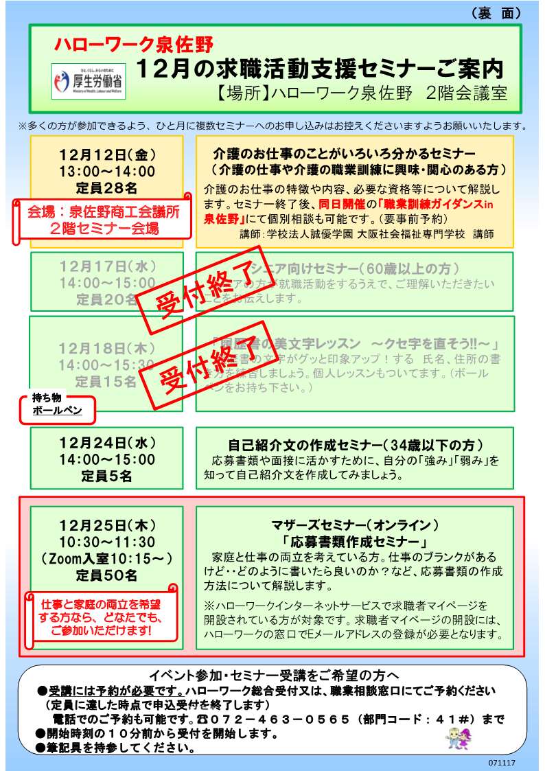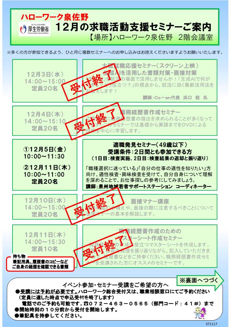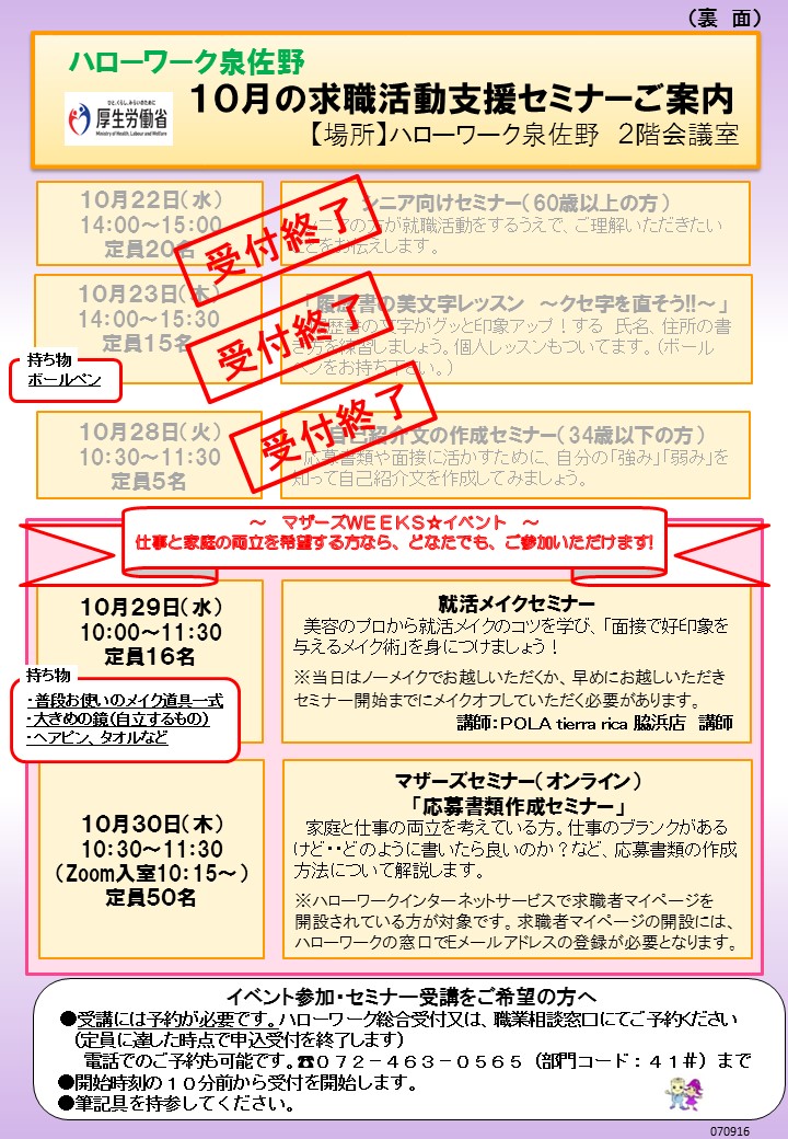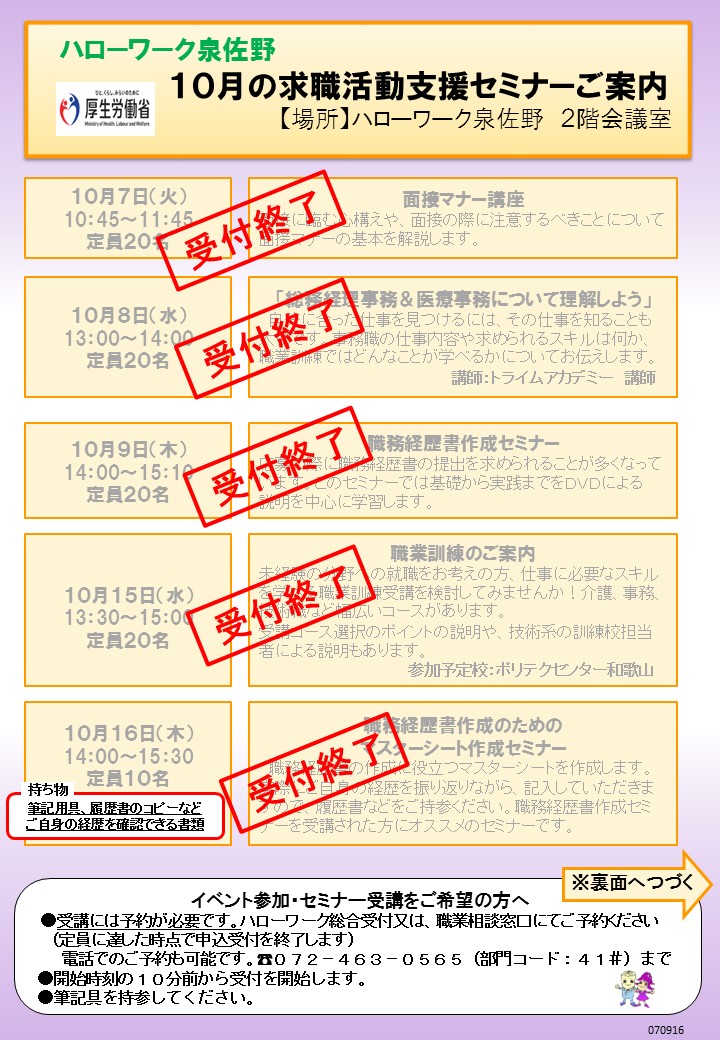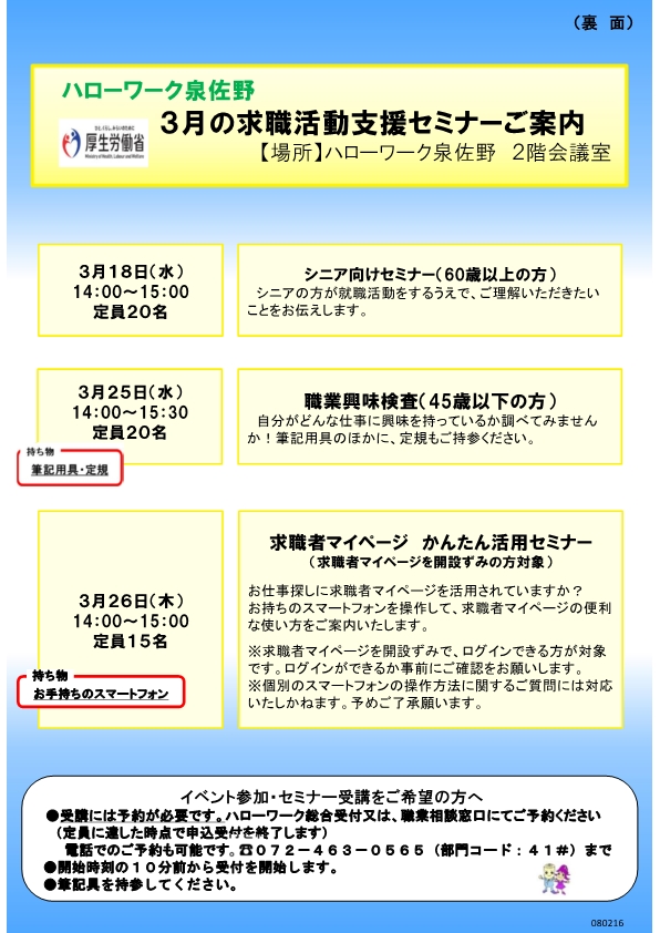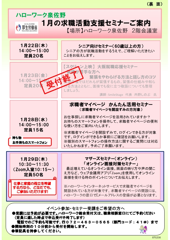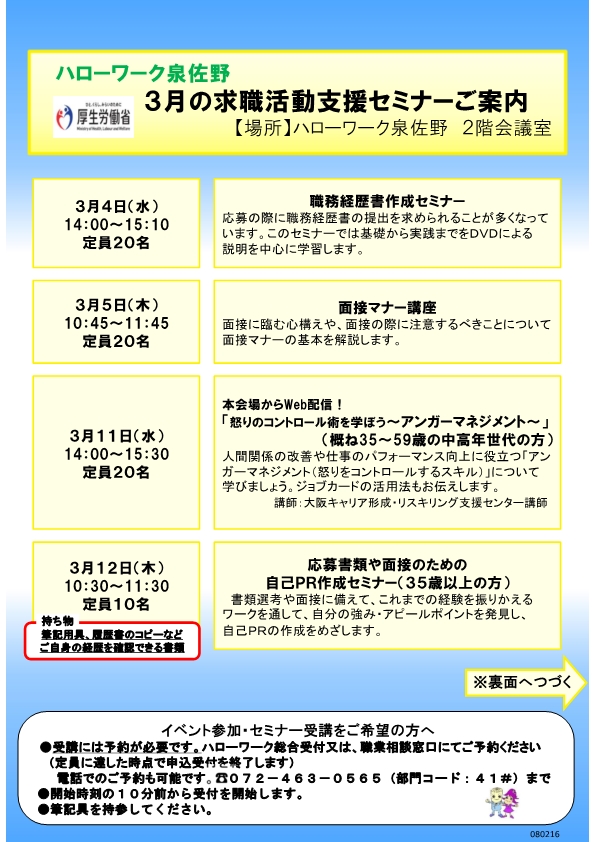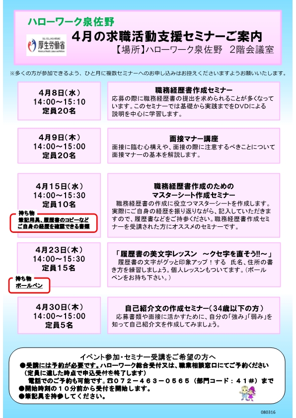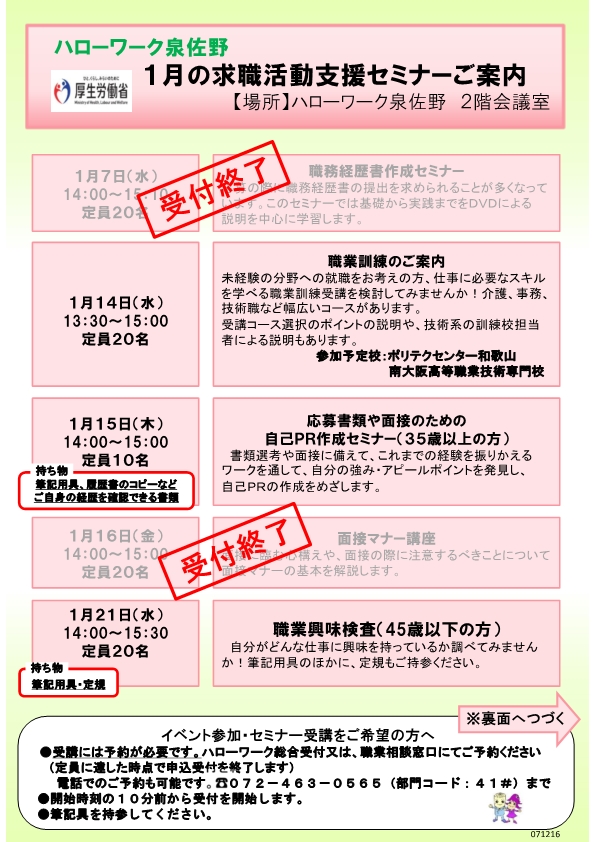 ハローワーク泉佐野では、求職活動の状況に応じて、様々なセミナーを開催しております。