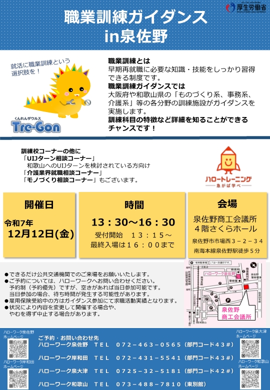 ハローワーク泉佐野 職業相談部門(代表TEL:072-463-0565)までお電話ください。