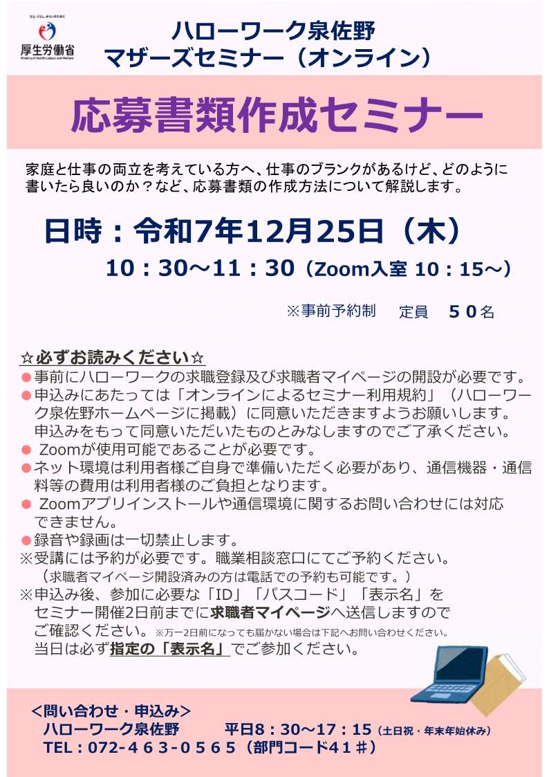 | 12月25日(木)マザーズセミナー(オンライン) ↓「応募書類作成セミナー」用資料はこちら↓ |