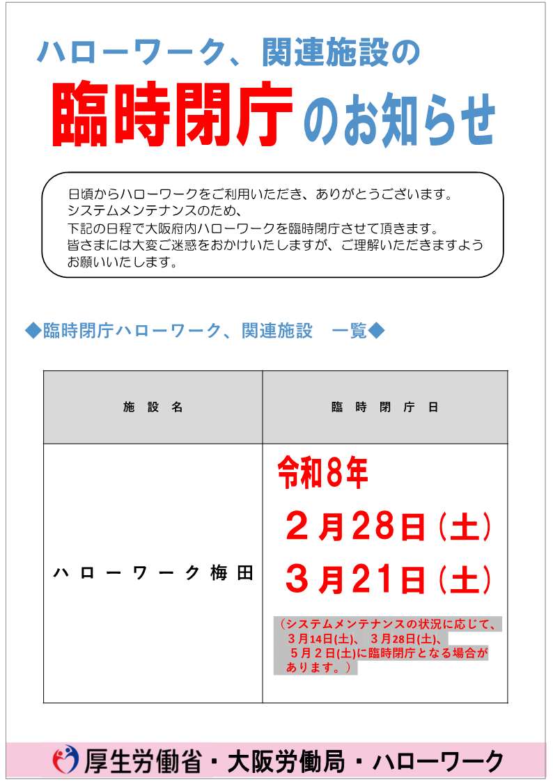 ハローワーク梅田はシステムメンテナンスのため 令和8年2月28日(土)、令和8年3月21日(土)は臨時閉庁させていただきます。 皆さまには大変ご迷惑をおかけいたしますが、ご理解いただきますようお願いいたします。 その他閉庁ハローワーク・関連施設につきましては、こちら↓の画像クリックしてご確認ください。