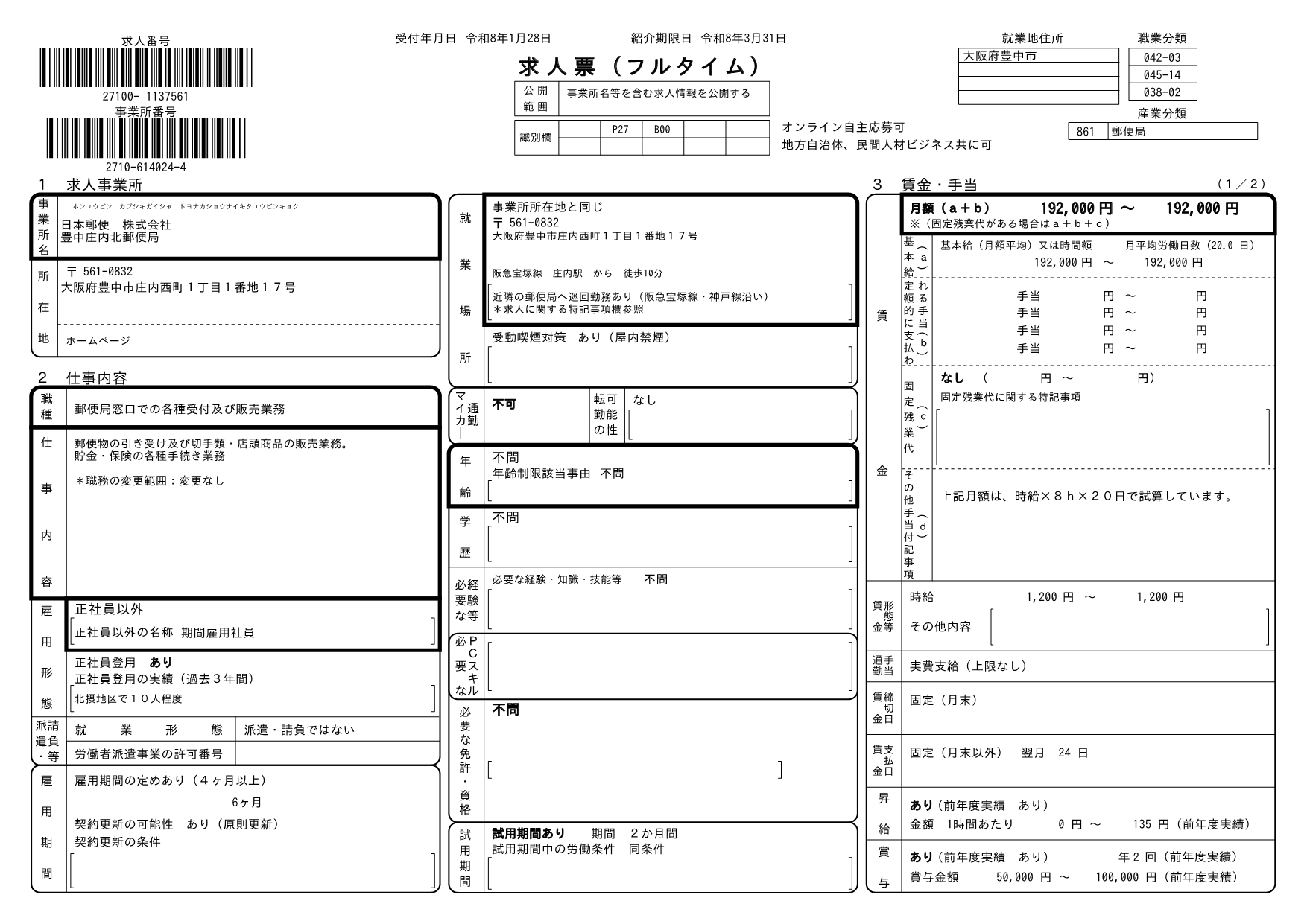 募集職種 郵便局窓口での各種受付及び販売業務【期間雇用社員】