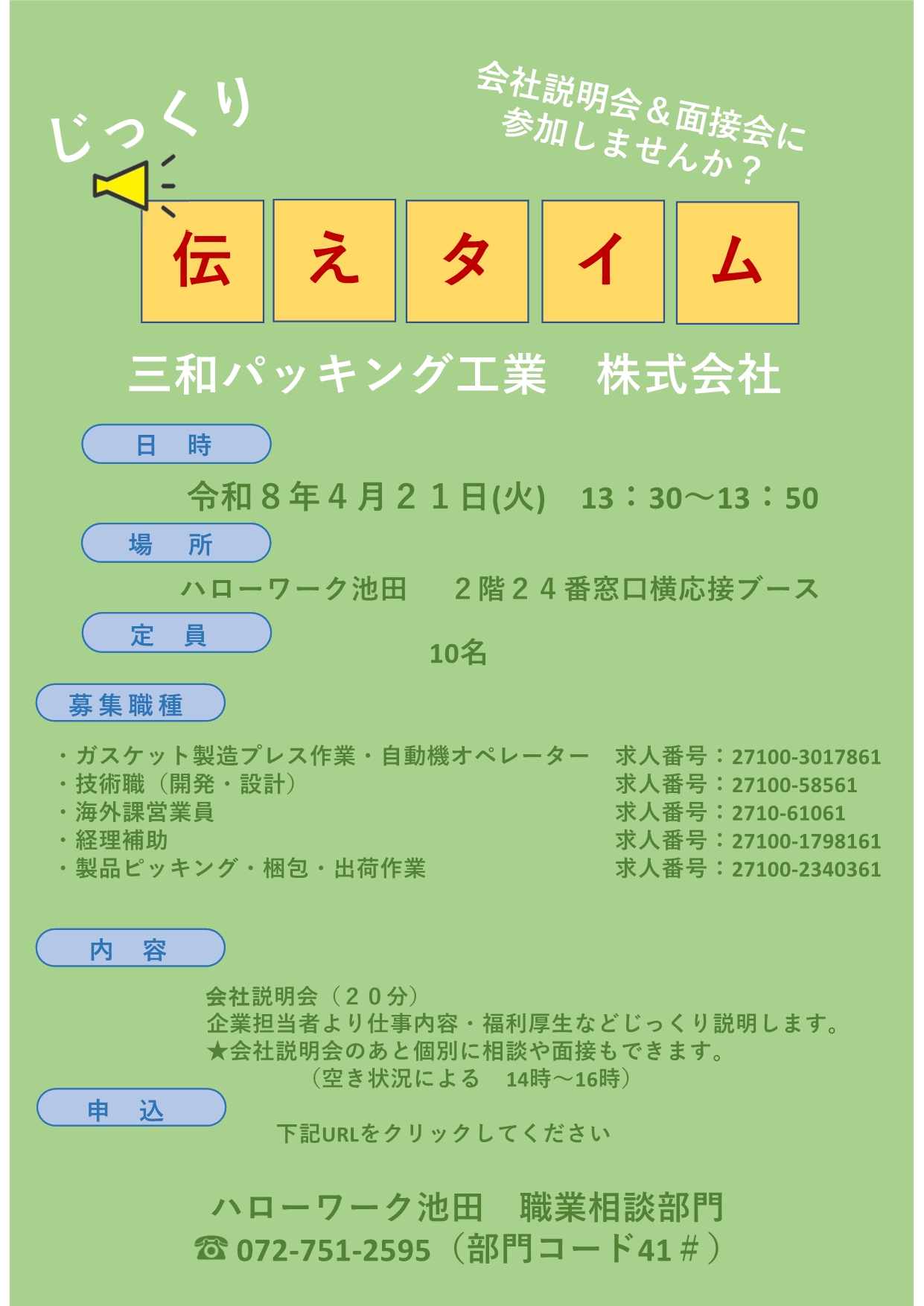 ハローワーク池田で開催している会社説明・面接会の前に行われる企業説明会です。