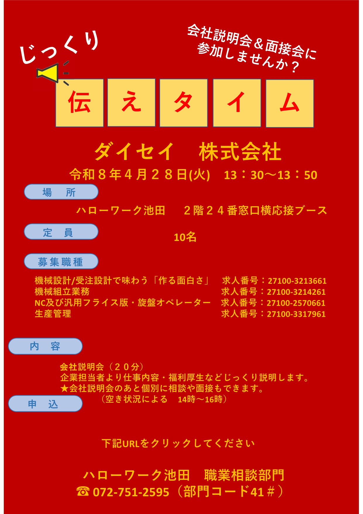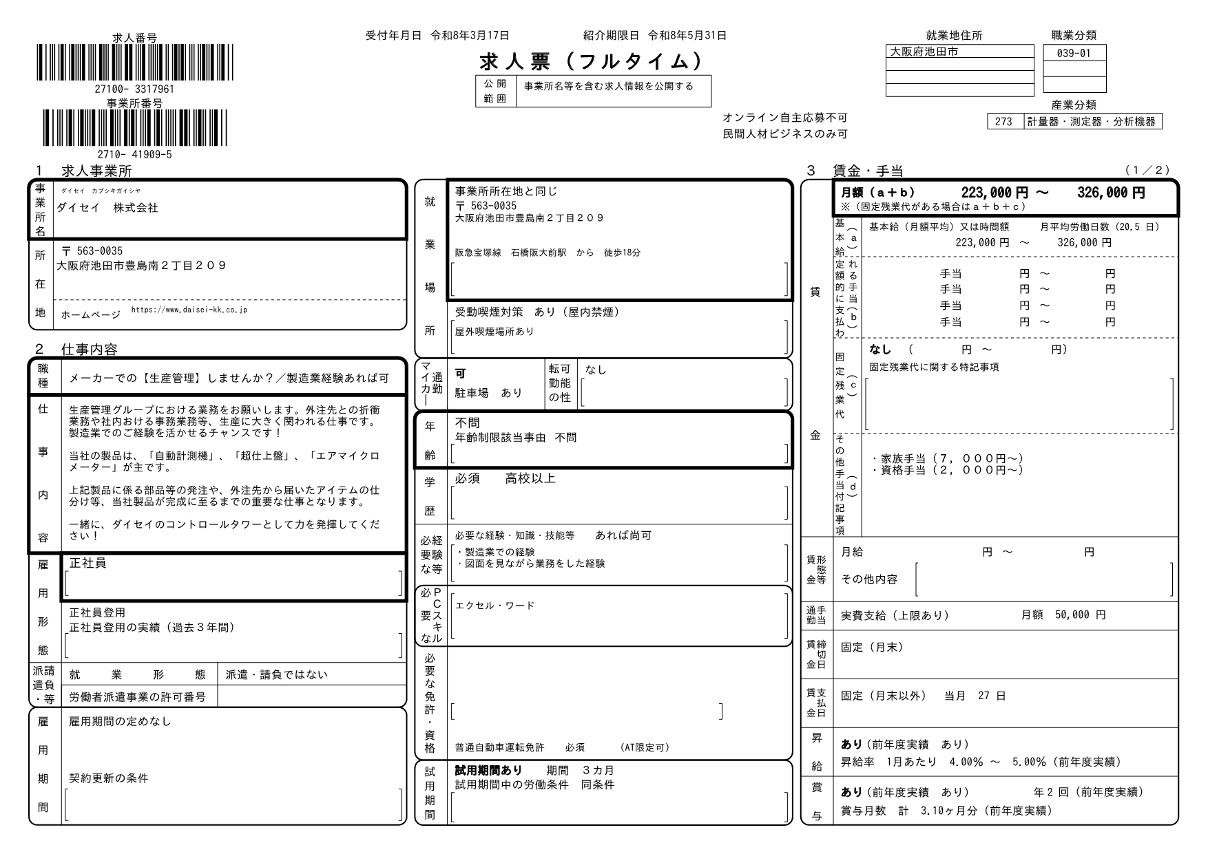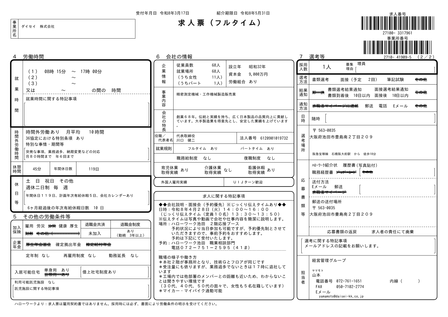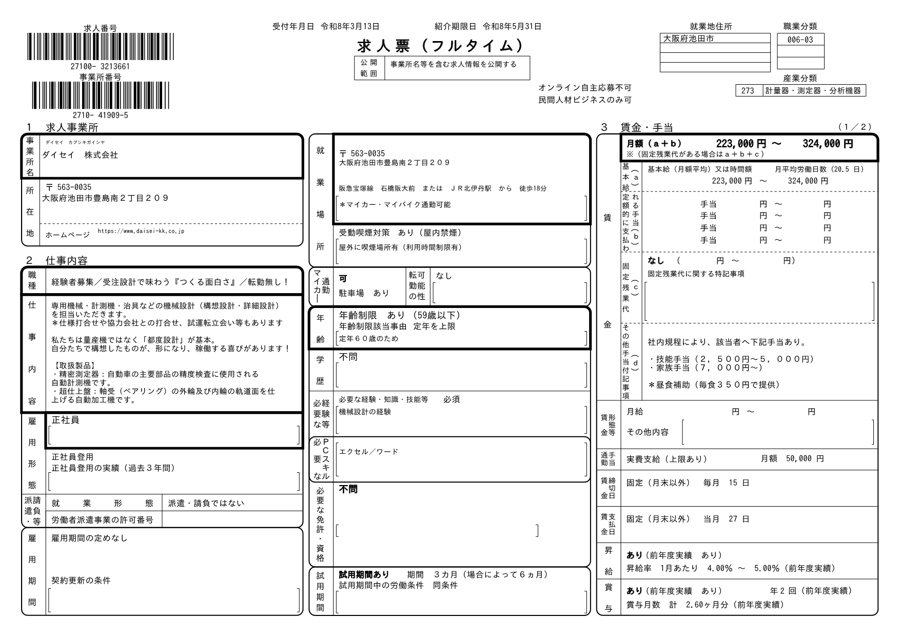 ダイセイ株式会社 求人票をクリックするとPDFでご覧いただけます。