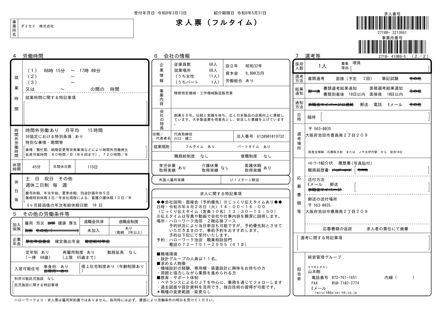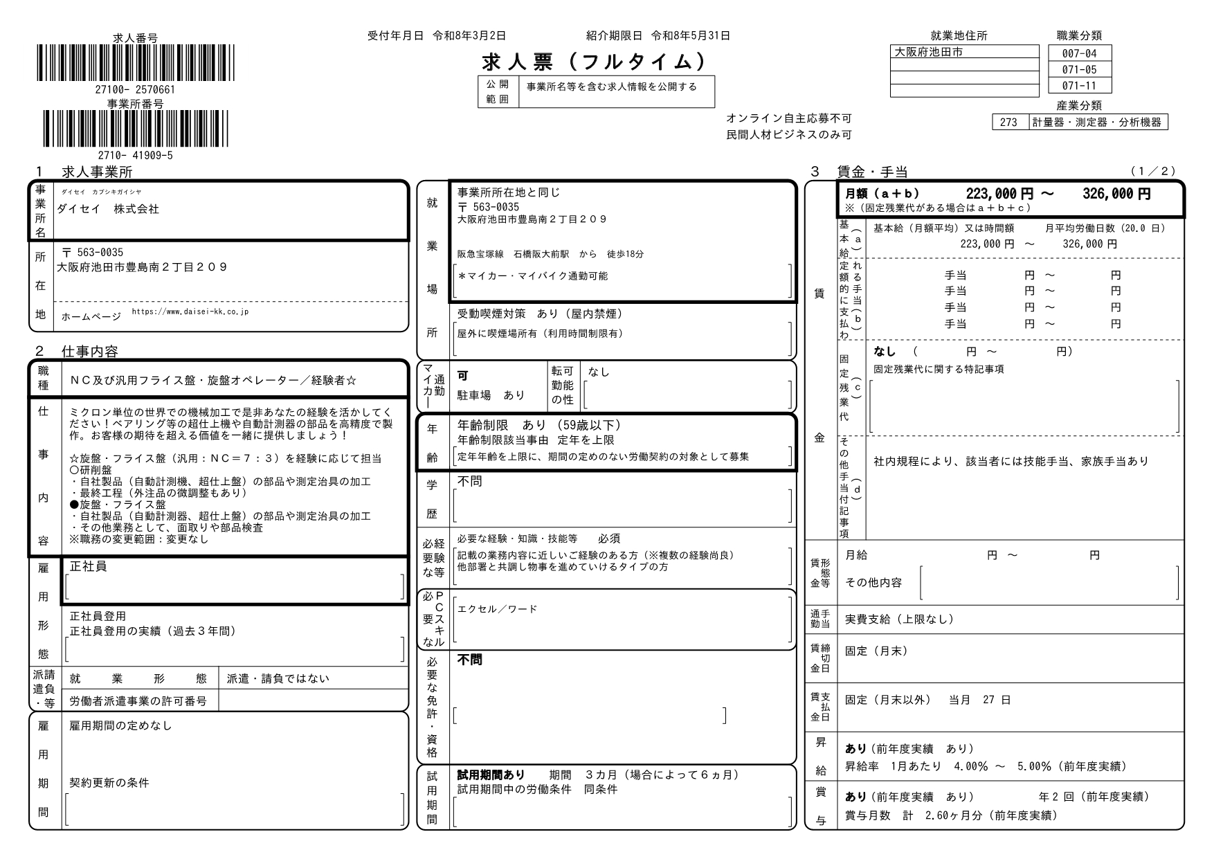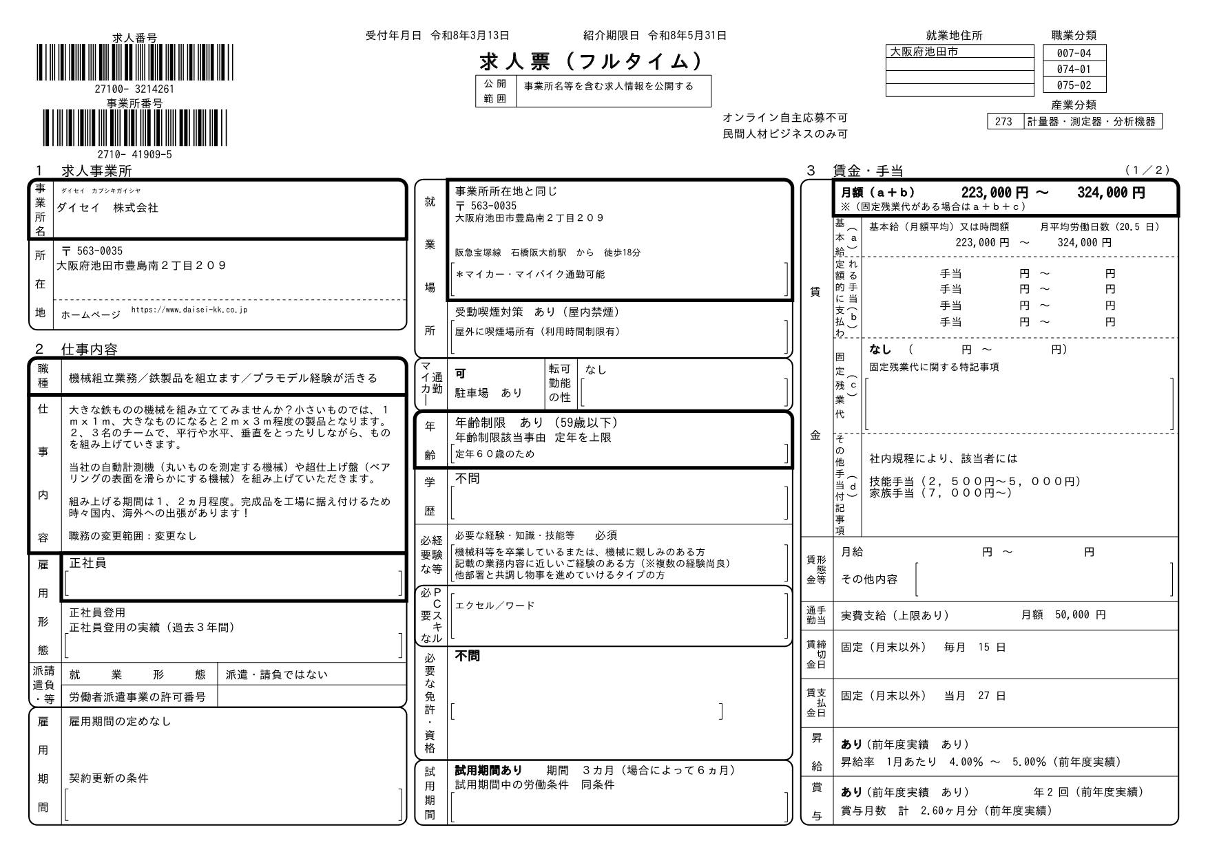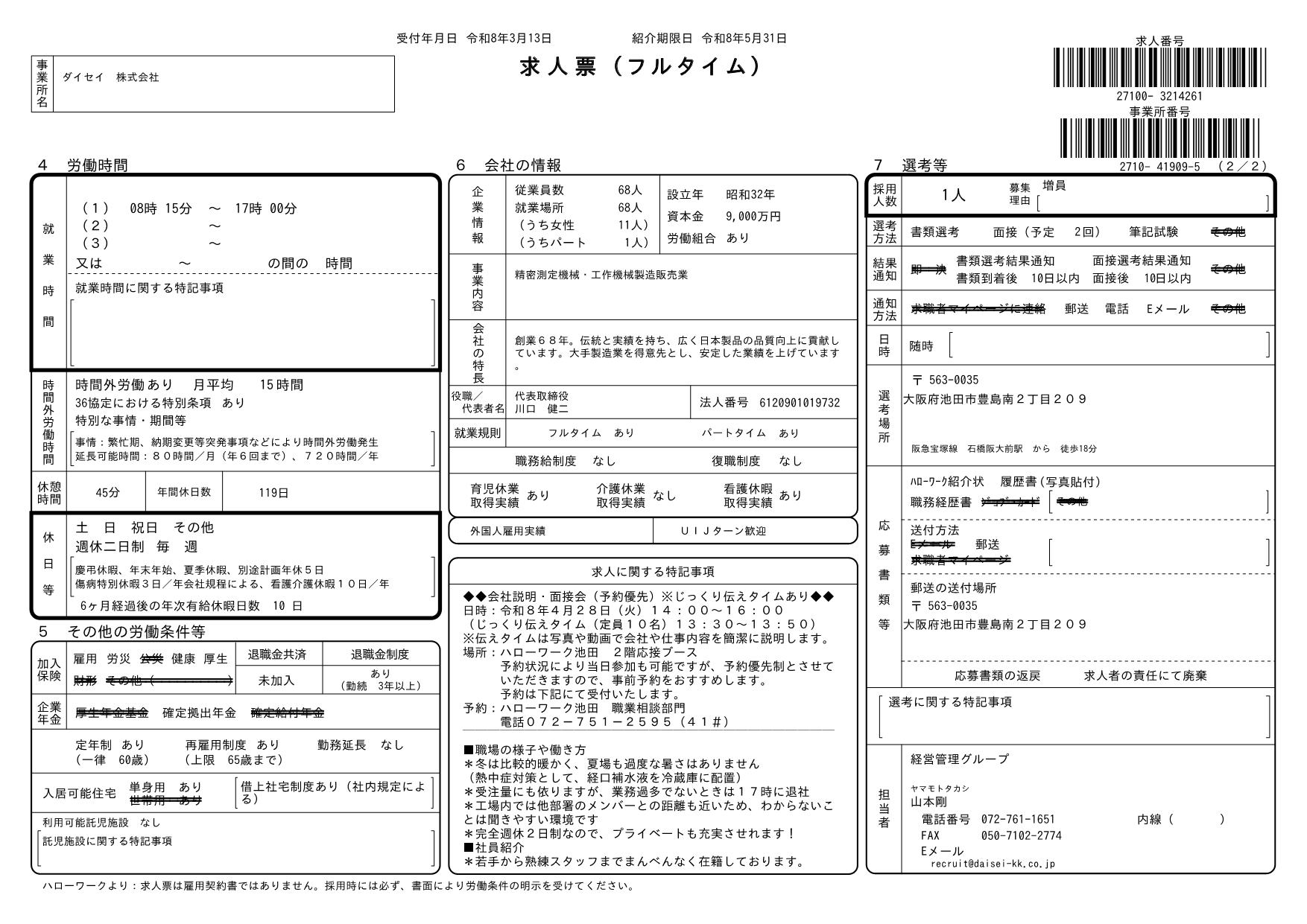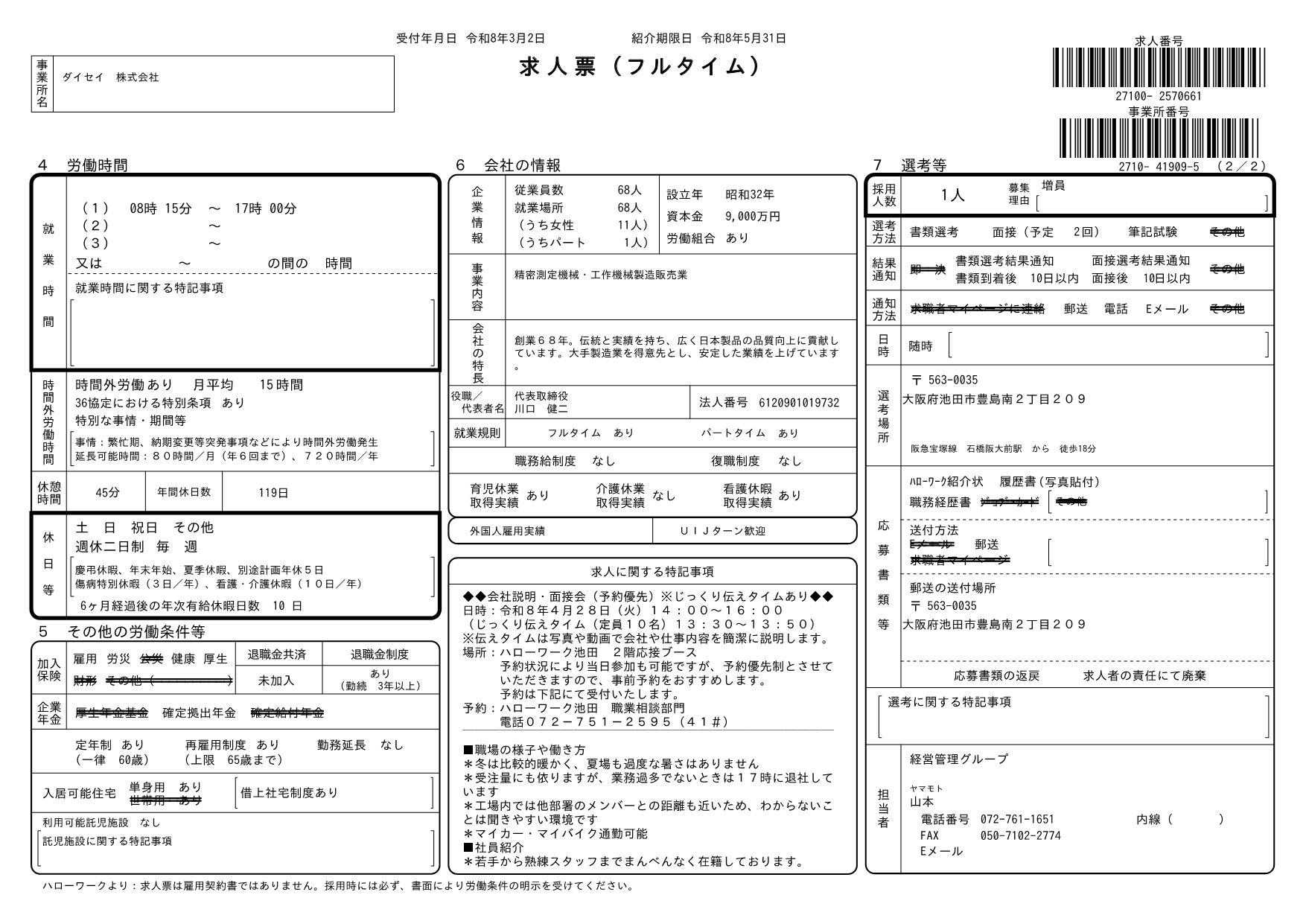 ダイセイ株式会社 求人票をクリックするとPDFでご覧いただけます。