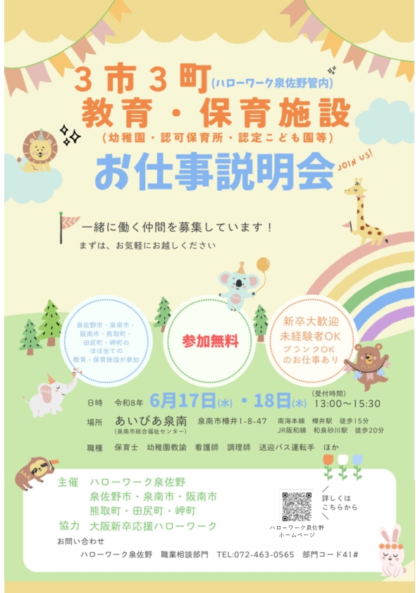 ご不明点等ございましたら、ハローワーク泉佐野事業所サービス・企画部門(072-463-0565(部門コード31#))まで、ご連絡ください。