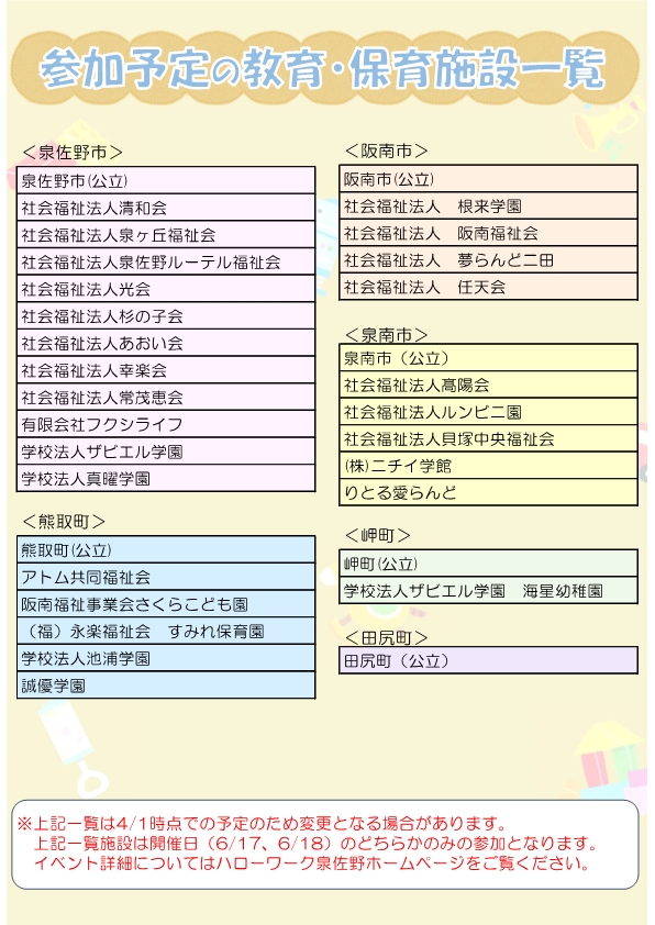 6月17日(水)、18日(木)3市3町教育・保育施設お仕事説明会に参加予定の施設様へ