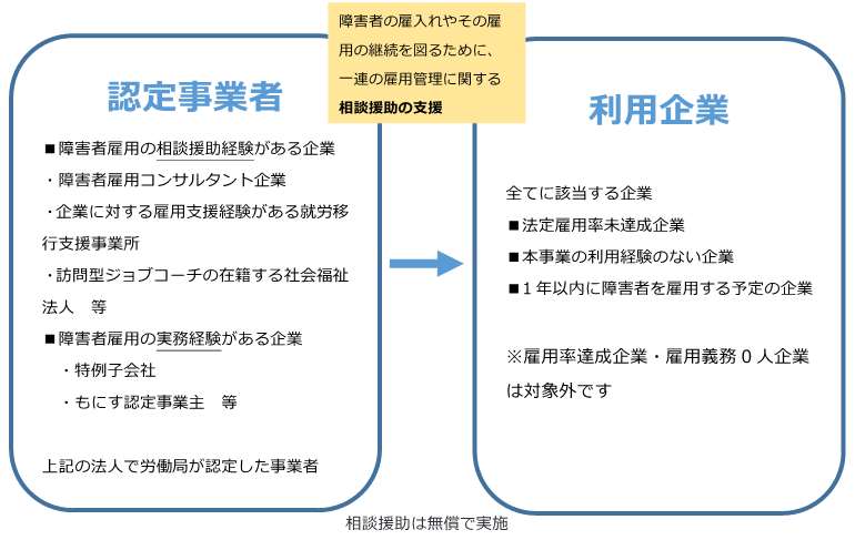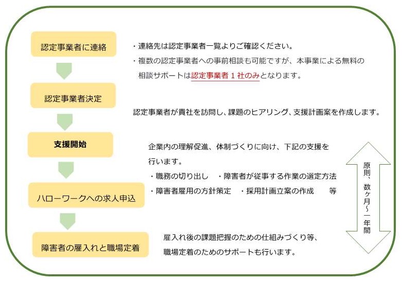 本事業では、各都道府県の労働局長により認定された認定事業者が、伴走型で障害者雇用を実現できる体制づくりを支援します。